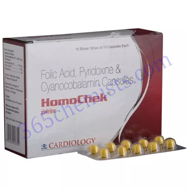 Homochek capsule is a multivitamin formulation that balances vitamin content, which is required for the metabolism of various minerals and other nutrients, contributing to growth and development. It is a nutritional supplement which is used to maintain a healthy central nervous system, helps in the growth and repair of cells of the body and boosts the immune system.