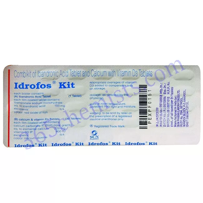 Idrofos Kit is a combination medication that is used for the treatment of osteoporosis as well as the prevention of the disease. Ibandronic acid and vitamin D3 are both present, and these two ingredients collaborate to increase bone density and decrease the likelihood of fractures. Be sure to take the recommended precautions and follow the dosage instructions provided by your healthcare professional. If you experience any side effects that make you concerned, you should stop using the Idrofos Kit immediately and speak with a healthcare professional for further instructions.