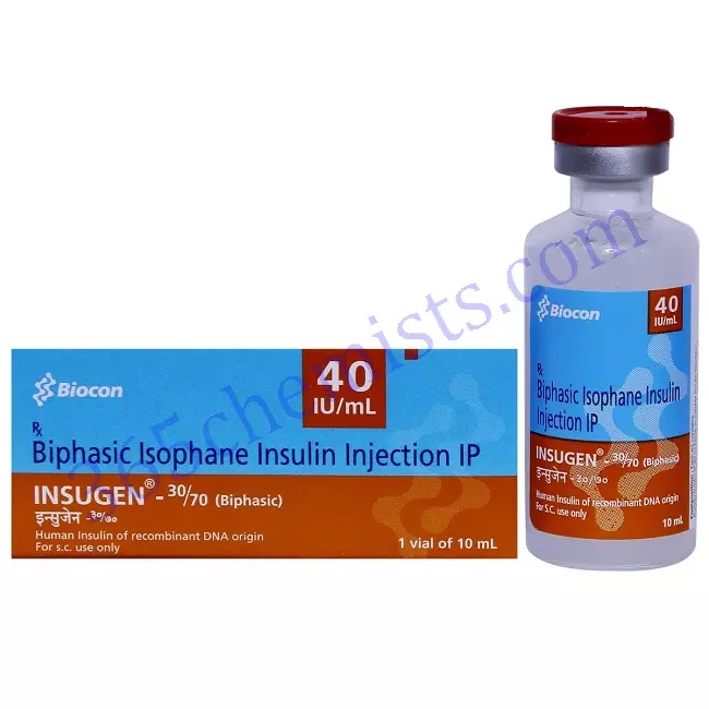 - Control of Blood Sugar The Insugen 30/70 Injection can assist individuals with diabetes in maintaining a healthy blood sugar level. A combination of soluble insulin and insulin isophane suspension enables immediate glucose control after meals as well as sustained blood sugar management in between meals. This is made possible by the insulin’s ability to dissolve in water. Individuals are able to maintain optimal glycemic control throughout the day with the assistance of this comprehensive approach.