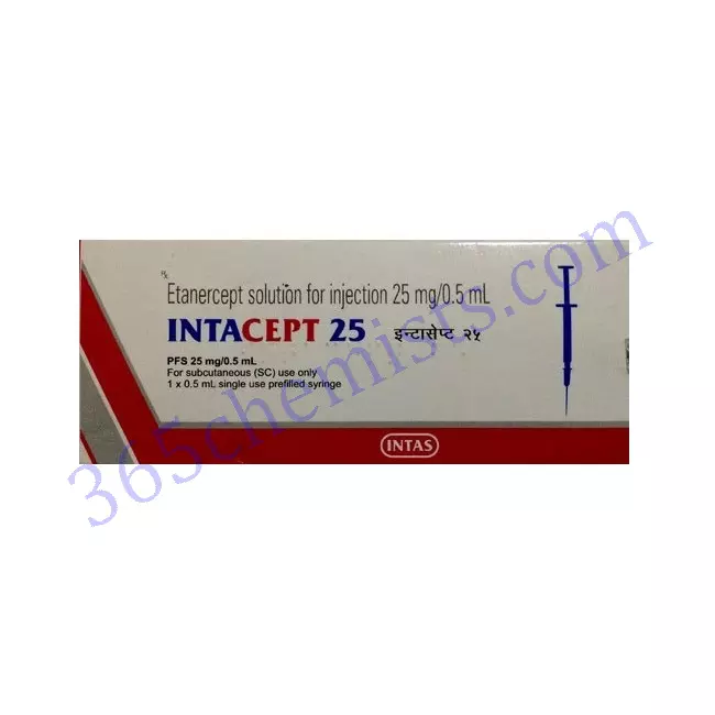 Intacept 25 mg Injection Solution for Intravenous Use Individuals who suffer from inflammatory conditions such as rheumatoid arthritis, psoriasis, or ankylosing spondylitis have access to a potent treatment option in the form of Etanercept 0.5 millilitres, which comes in a volume of 0.5 millilitres. Intacept works by inhibiting TNF-alpha, which results in a significant reduction in inflammation, relief from symptoms, and possibly a slower progression of the disease. Because of the medication’s low risk of side effects and the fact that it comes in pre-filled syringes, it is an extremely useful instrument for the management of inflammatory conditions. Consult with a healthcare professional who is experienced in the treatment of these conditions to determine if Intacept 25mg Solution for Injection is suitable for your specific needs. If it is, you will be able to experience the benefits of this targeted therapy in managing inflammation and improving your quality of life. Consult with a healthcare professional who is experienced in the treatment of these conditions.