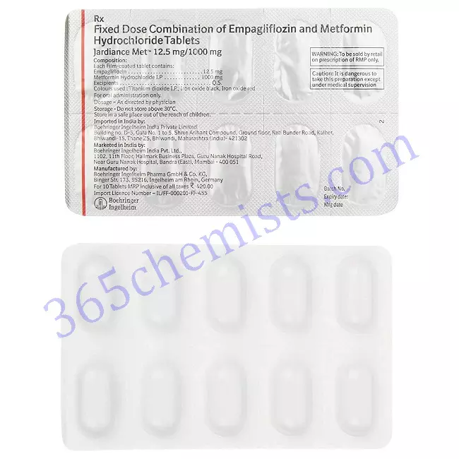 Jardiance Met 12.5mg/1000mg Tablet contains two key active ingredients: Empagliflozin and Metformin. Empagliflozin is a sodium-glucose co-transporter 2 (SGLT2) inhibitor that promotes glucose excretion through the urine. Metformin is a biguanide that reduces glucose production in the liver and improves insulin sensitivity. The combined effects of these ingredients provide a comprehensive approach to managing blood sugar levels.