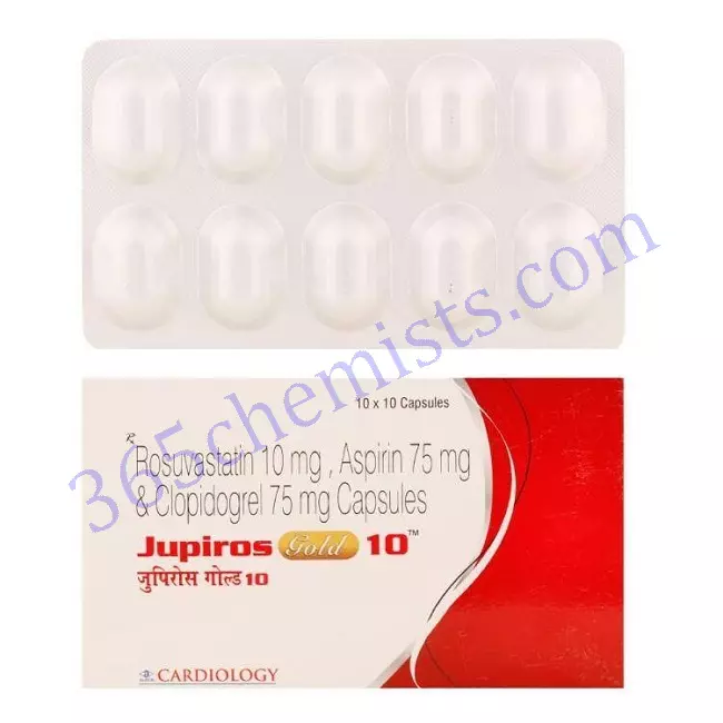 The active components of the combination medication known as Jupiros Gold 10mg Capsule are aspirin, rosuvastatin, and clopidogrel. This medication comes in the form of a capsule. This detailed analysis will provide helpful information regarding the applications, dosage, potential adverse effects, and safety considerations of the Jupiros Gold 10mg Capsule, as well as other essential particulars.