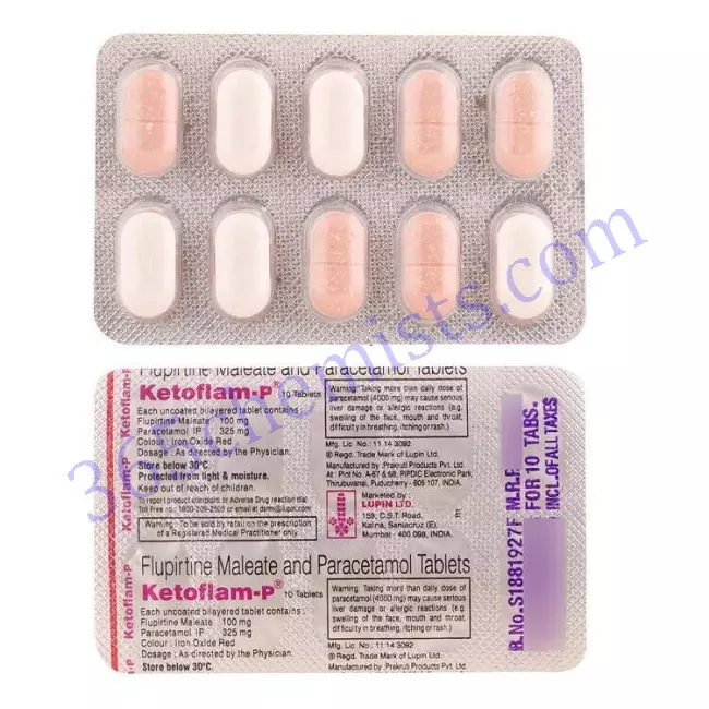A combination medication for the treatment of pain and inflammation, Ketoflam P Tablet (Flupirtine 100mg/Paracetamol 325mg) is prescribed to patients in order to alleviate their symptoms. Because it contains both flupirtine and paracetamol, it has an effect that is similar to that of a synergy. Due to the medication’s dosage, potential side effects, and precautions, it is imperative that this treatment be administered under the supervision of a qualified medical professional, despite the fact that it is generally well tolerated. It is highly recommended that you seek the personalised guidance of a healthcare professional in the event that you have any concerns or questions regarding the utilisation of Ketoflam P Tablet.