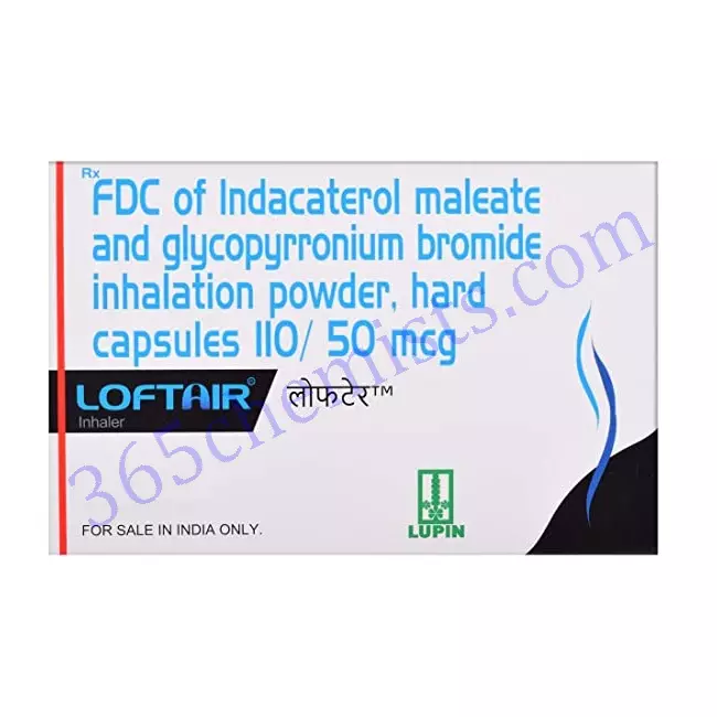 Loftair Capsule is a combination medication that is used for the management of COPD. Each capsule contains 110 micrograms of indacaterol and 50 micrograms of glycopyrrolate. Loftair Capsule helps to widen the airways and improve breathing for individuals who suffer from COPD. It accomplishes this by providing dual bronchodilation. It is absolutely necessary to strictly adhere to the dosages that have been prescribed and the directions given by a medical professional for use that is both safe and effective. Even though most people only experience mild discomfort that goes away quickly, it is important to let a doctor know about any symptoms that continue or become more severe right away. Loftair Capsule has the potential to make a significant contribution to the management of COPD, as well as improve patients’ respiratory health and overall well-being when individual circumstances are taken into account and necessary precautions are observed.
