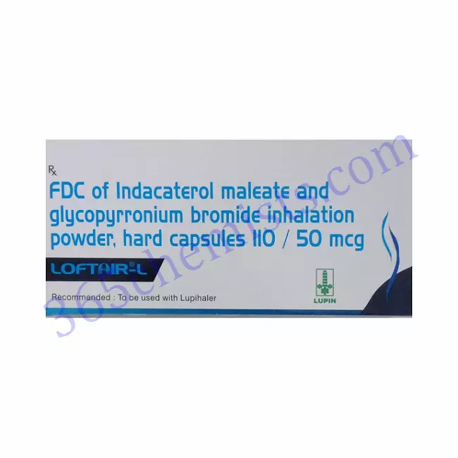 Loftair-L Capsule with Inhaler Kit is a combination of two medicines, namely: Indacaterol and Glycopyrrolate. Loftair-L Capsule with Inhaler Kit belongs to the group of medicines called bronchodilators used to treat Chronic Obstructive Pulmonary Disease (COPD). Indacaterol is a long-acting beta-agonist that relaxes and widens the openings in the airways, making it easier for the air to get in and out of the lungs. Glycopyrrolate is an anticholinergic that decreases the secretions in the airways. Together, Loftair-L Capsule with Inhaler Kit provides relief from COPD.