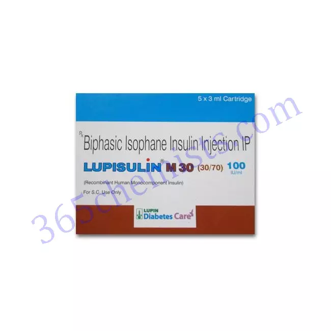 Lupisulin M 30 Solution for Injection 40IU/ml is a combination of two medicines, an intermediate-acting and a short-acting type of insulin. It is used in the treatment of diabetes mellitus (type 1 and 2) to improve blood sugar control both in adults and children. It helps maintain the blood sugar levels in diabetic patients.