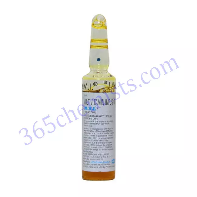 M.V.I. Injection is a sterile multivitamin formulation that contains essential vitamins, including vitamin A and thiamine. Patients who are unable to obtain sufficient vitamins through oral consumption alone receive it intravenously so that vitamin deficiencies can be remedied and nutritional support can be offered. M.V.I. Injection helps maintain overall health by ensuring adequate levels of vitamins, which benefits a number of bodily functions, including vision, energy metabolism, and immune function. The administration of it is closely monitored by professionals in the healthcare industry, and the dosage is adjusted as necessary to meet the requirements of each individual patient. If you have any questions or concerns about the use of M.V.I. Injection, you should speak with a healthcare professional to receive individualised advice and direction on the matter.