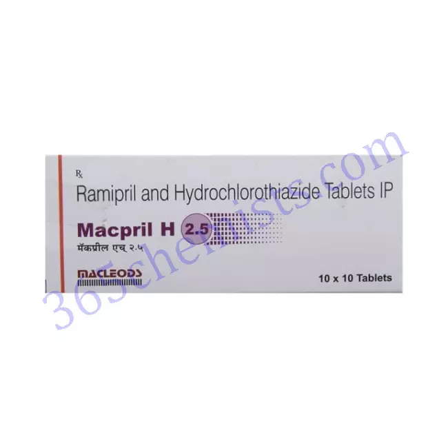 The Macpril H 2.5mg Tablet is a combination medication that contains two active ingredients: ramipril and hydrochlorothiazide. These two ingredients work together to treat high blood pressure. Both ramipril and hydrochlorothiazide are classes of medications known as angiotensin-converting enzyme (ACE) inhibitors and diuretics, respectively. Individuals who require treatment with both medications are considered candidates for the management of hypertension (also known as high blood pressure) with this combination medication.