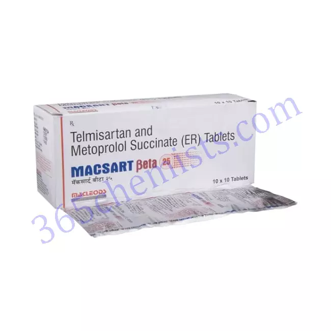 Macsart Beta 25mg Tablet ER is an effective hypertension management medication that combines the benefits of two medications: telmisartan and metoprolol succinate. Telmisartan achieves its therapeutic effect by inhibiting the actions of angiotensin II, a hormone that narrows blood vessel diameter. Telmisartan works to lower blood pressure by inhibiting the activity of angiotensin II. This results in a relaxation of the blood vessels and an increase in their diameter. As a beta-blocker, Metoprolol Succinate slows the heart rate and lowers blood pressure by preventing the action of certain chemicals in the body, like adrenaline, that can speed up the heartbeat and raise blood pressure. Metoprolol Succinate contributes to a reduction in blood pressure by slowing the heart rate and lessening the force with which the heart contracts.