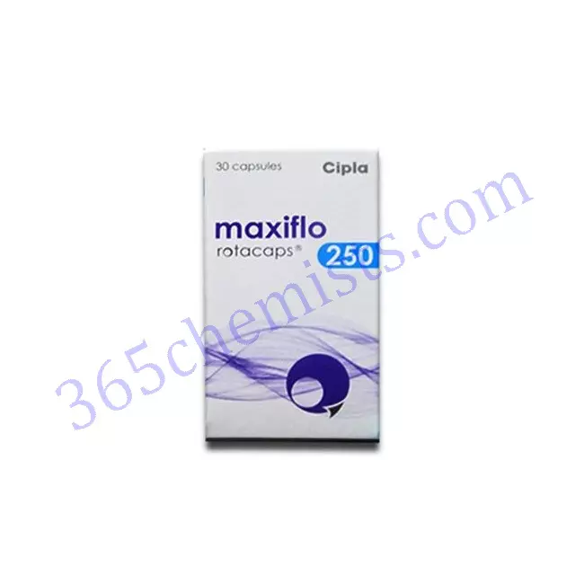 Maxiflo 250mg Rotacaps 30’s is a combination of two drugs, namely: Formoterol and Fluticasone propionate that is used to treat symptoms of asthma and chronic obstructive pulmonary diseases (COPD). Formoterol belongs to the class of bronchodilators that works by relaxing muscles and widening the airways of the lungs. Thus, it makes breathing easier. Fluticasone propionate belongs to the class of corticosteroids that works by acting inside cells of the nasal lining and stops the release of certain chemicals in the body that cause inflammatory reactions. Thereby, provides relief from sneezing, runny or blocked nose and sinus discomfort.