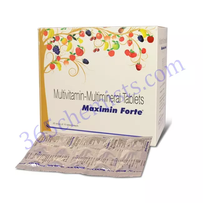 Maximin forte is a multimineral and multivitamin preparation used as a supplemental aid. Maximin forte is enriched with vitamin A, cholecalciferol, thiamine, riboflavin, niacinamide, folic acid, pyridoxine, calcium pantothenate, cyanocobalamin, ascorbic acid, tocopheryl acetate, magnesium, zinc, manganese, copper, selenium, chromium. Zinc boosts immunity. Vitamin A is useful for eyes and ascorbic acid helps in growth and repair of various tissues throughout the body. The various B vitamins help in metabolism of fat, proteins and carbohydrates and increases energy. They also act as neuroprotectant.