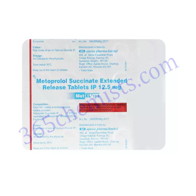 Tablets of Met XL 12.5mg are a type of medication that is frequently utilised in the treatment of hypertension, angina, and specific heart rhythm disorders. Its active component, Metoprolol Succinate, contributes to the lowering of blood pressure, the slowing of the heart rate, and the improvement of the function of the heart. Individuals who are diagnosed with certain medical conditions are required to take precautions and undergo close monitoring, and potential drug interactions should also be taken into consideration. Utilisation of Met XL12.5mg Tablet in a manner that is both safe and effective requires strict adherence to the recommended dosage, as well as consistent check-ins with a qualified medical practitioner. Consult your healthcare provider for individualised guidance and support in the event that you have any worries or questions regarding this medication.