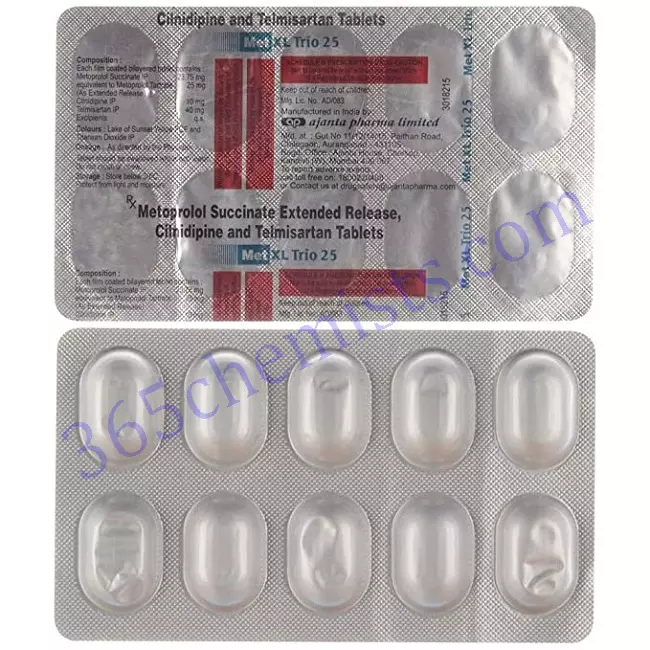 Cilnidipine is a calcium channel blocker that is utilised in the treatment of hypertension (also known as high blood pressure). It is found in the Met XL Trio 25mg Tablet. It belongs to the class of calcium channel blockers known as dihydropyridine, and it achieves its antihypertensive effects by relaxing and dilatation of the blood vessels, thereby lowering the amount of resistance that the blood encounters as it flows through the body. This article provides a detailed explanation of the applications, dosage, and safety considerations associated with the Met XL Trio 25mg Tablet.