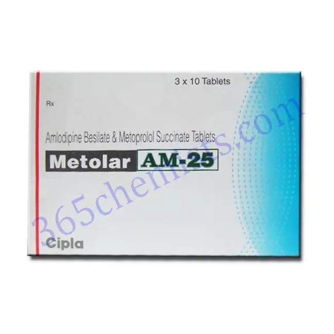 Tablets of Metolar AM 25mg contain both amlodipine and metoprolol succinate, which together make up the two active components of this combination medication. It is prescribed to patients suffering from hypertension (also known as high blood pressure) as well as a variety of cardiovascular conditions. Both amlodipine and metoprolol succinate are classified as calcium channel blockers, but amlodipine is more specifically a calcium channel blocker. By reducing the amount of work that needs to be done by the heart, as well as lowering blood pressure, this combination medication helps improve overall cardiovascular function.