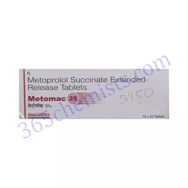 The Metomac 25mg Tablet is a medication that is commonly prescribed for the treatment of hypertension, angina, and cardiac arrhythmias. This medication contains Metoprolol Succinate. It accomplishes this by lightening the load placed on the heart, as well as by controlling both the rate of the heartbeat and the blood pressure. It is absolutely necessary for successful treatment outcomes that you take the medication exactly as directed, keep a close eye out for any potential adverse effects, and stay in regular contact with your healthcare provider. If you have any questions or concerns about Metomac 25 mg Tablet, you should speak with your healthcare provider to receive individualised guidance on the topic.