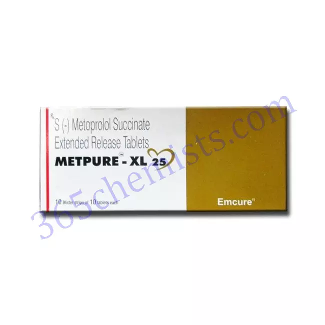 S-Metoprolol Succinate is the active component in the medicine known as Metpure XL 25 mg tablet. This medication is taken by mouth. It is most commonly used for the treatment of hypertension (also known as high blood pressure), angina (also known as chest pain), and other conditions related to the cardiovascular system. beta-blockers are the class of drugs to which it belongs. The medication is released gradually from the tablet, which ensures that it will continue to be effective for a longer period of time than it would be otherwise.