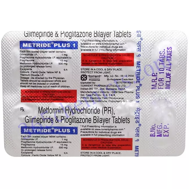 Metride Plus 1 Tablet, which contains Glimepiride, Metformin, and Pioglitazone, provides an all-encompassing method for the control of diabetes type 2. It accomplishes this by combining three active components, each of which has a unique mode of action. As a result, it tackles various facets of glucose regulation and provides good glycemic control. It is essential to be aware of the possibility of experiencing adverse effects and to strictly stick to the dosage and administration instructions that have been prescribed. It is crucial to maintain routine follow-up appointments with one’s healthcare professionals in order to assess the patient’s reaction to treatment, modify the treatment plan as required, and achieve optimal control of type 2 diabetes mellitus.