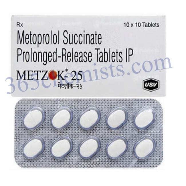 Metzok 25mg Tablet is used to treat high blood pressure, chest pain, irregular heartbeat, and to protect the heart after a heart attack.