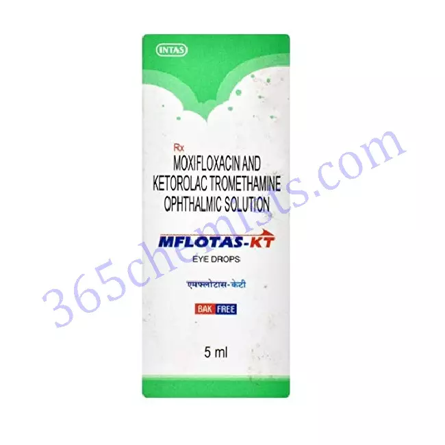 Ketorolac 0.4% and moxifloxacin 0.5%, the active ingredients in Mflotas KT Eye Drop, work synergistically to provide effective treatment for bacterial infections and inflammation of the eye. Mflotas KT Eye Drop is able to provide comprehensive relief and healing for a wide variety of ocular conditions as a result of its synergistic combination of the anti-inflammatory and antibacterial properties of these medications. Mflotas KT Eye Drop is a dependable option for both healthcare professionals and patients who are looking for effective ocular treatment due to the fact that it is simple to use and has a favourable safety profile. Make an appointment with your primary care physician to discuss whether or not Mflotas KT Eye Drop is appropriate for the treatment of your unique eye condition, and then get started on the path to better ocular health.