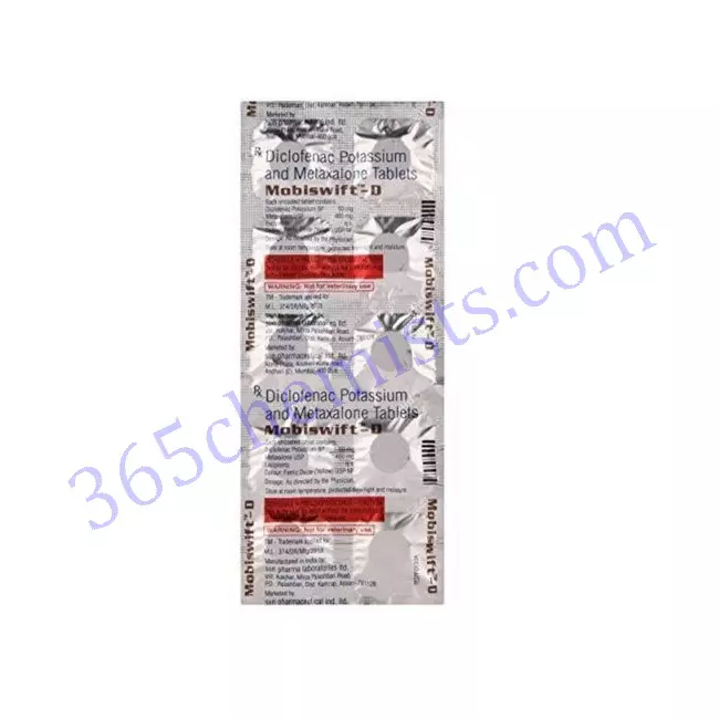 Because it contains both diclofenac and metaxalone, the medication known as Mobiswift-D Tablet is an effective treatment that offers pain relief as well as relaxation of the muscles. It provides a comprehensive solution for musculoskeletal conditions because it combines the anti-inflammatory effects of diclofenac with the muscle relaxant effects of metaxalone. Mobiswift-D Tablet assists individuals in regaining their mobility and experiencing an overall improvement in their quality of life by lowering levels of pain and inflammation, as well as relieving muscle spasms and tension. It is essential, however, to take this medication in accordance with the instructions of a qualified medical professional and to be aware of any potential adverse effects. Individuals can experience the benefits of Mobiswift-D Tablet and live a life that is less marred by discomfort and pain if they take the medication as directed and adhere to the recommended dosage and administration procedures.