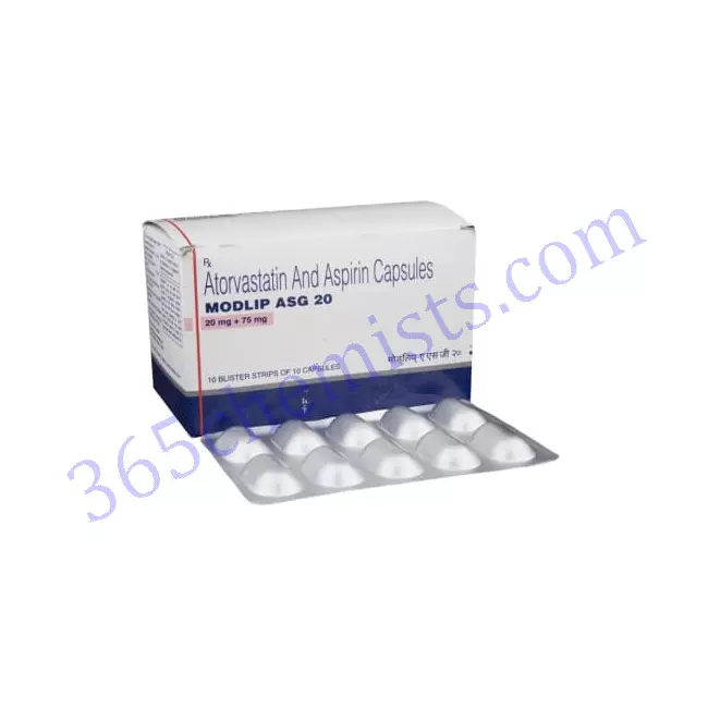 The active ingredients in the combination medication known as Modlip Asg 20mg Capsule are the statin drug atorvastatin and the pain reliever aspirin. It is recommended for the treatment of cardiovascular conditions, such as high cholesterol levels and the avoidance of heart attacks and strokes, as well as for management of these conditions. In order to offer comprehensive protection to the cardiovascular system, Modlip Asg combines the benefits of atorvastatin and aspirin, both of which have been shown to reduce cholesterol levels.