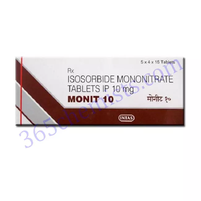 Monit 10mg Tablet 15’s belong to a class of medicines called nitrate vasodilators. These operate by relaxing the blood vessels of the heart, reducing the stress on the heart making it easier to pump blood. Monit 10 Tablet 15’s is used to prevent attacks of angina pectoris. Angina usually feels like a tight chest pain, neck or arm area. The pain originates from the heart muscle and is a sign that part of it is not getting enough oxygen for the amount of work it is doing.