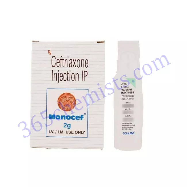 A highly potent medication that is used for the treatment of severe bacterial infections, Monocef 2gm Injection contains 2gm of ceftriaxone and is available as an injection. Because of its broad-spectrum activity, versatility, and efficacy, it is a trusted choice among medical professionals for the management of complicated skin and soft tissue infections, deep-seated urinary tract infections, and respiratory tract infections. Monocef 2gm Injection is able to effectively control severe infections, alleviate symptoms, and promote recovery when the prescribed dosage is followed, safety precautions are adhered to, and consultation with a healthcare provider is sought. It is recommended that you speak with your healthcare provider if you have any questions or concerns regarding the use of Monocef 2gm Injection. Your healthcare provider can provide you with individualised guidance and information. With the help of Monocef 2gm Injection, you will receive effective treatment and be able to restore your health.