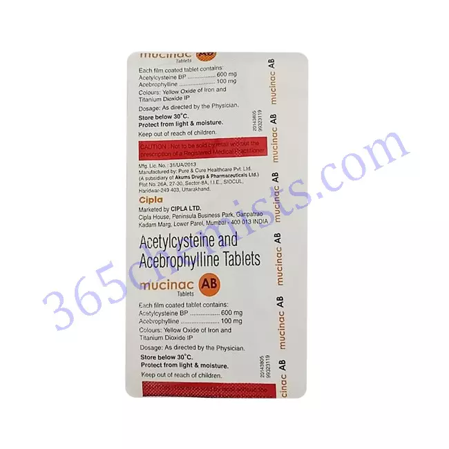 Mucinac AB Tablet 10’s is a combination of two drugs, namely: Acebrophylline (mucolytic and bronchodilator) and Acetylcysteine (mucolytic agent/sputum thinner). Acebrophylline belongs to the class of bronchodilators with additional mucolytic properties and works by relaxing muscles and widening the airways of the lungs. Acetylcysteine belongs to the class of mucolytic agents (cough/sputum thinner) that works by thinning and loosening phlegm (mucus) in lungs, windpipe and nose. Mucinac AB Tablet 10’s breakdown the acid mucopolysaccharide fibres that make the mucus (sputum) thinner and less dense/viscous removing sputum efficiently by coughing. However, the viscosity of sputum remains low for as long as treatment is maintained. Together, they help to cough out easily and makes breathing easier by opening airways.