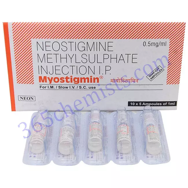 When it comes to providing neuromuscular support, the medication known as Myostigmin 0.5mg Injection 1ml, which contains Neostigmine 0.5mg, is a potent and essential choice. Individuals are given the ability to take proactive steps towards improved muscle strength, coordination, and overall well-being when they receive treatment with Myostigmin 0.5mg Injection 1ml. This is accomplished by increasing the availability of acetylcholine and enhancing neuromuscular transmission. It is essential for patients to follow the recommended usage guidelines for this medication, rely on trained healthcare professionals for administration, and promptly report any side effects to their healthcare provider. This is true for any medication. You can improve your neuromuscular function, mobility, and overall quality of life by taking advantage of the benefits offered by Myostigmin 0.5mg Injection 1ml and getting started on your journey today. Always check with a healthcare professional to get individualised recommendations and directions on the treatment plan that will work best for your particular neuromuscular requirements.