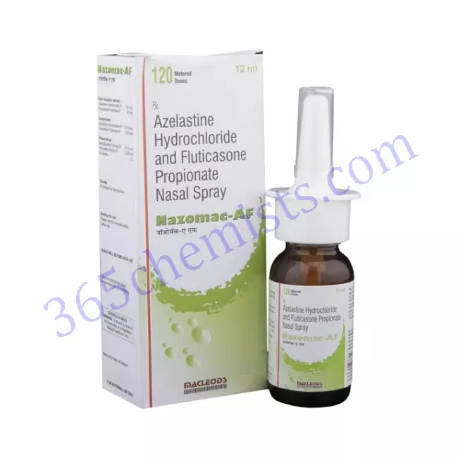 Relief from allergy symptoms: The combination of Fluticasone and Azelastine in NazomacAF Nasals Spray helps to relieve and enhance nasal comfort by reducing symptoms like nasal congestion, sneezing, itching, and runny nose.