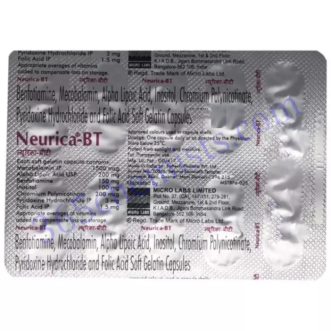 The innovative Neurica BT Soft Capsule is a dietary supplement designed to support and nurture nerve health. It contains a potent combination of alpha-lipoic acid and benfotiamine, both of which are known to have beneficial effects. This formulation provides a natural solution to address concerns related to nerves and promote overall health and wellness. Neurica BT Soft Capsule is an invaluable supplement to any health routine, given the evidence that it is effective and the potential advantages it may confer.