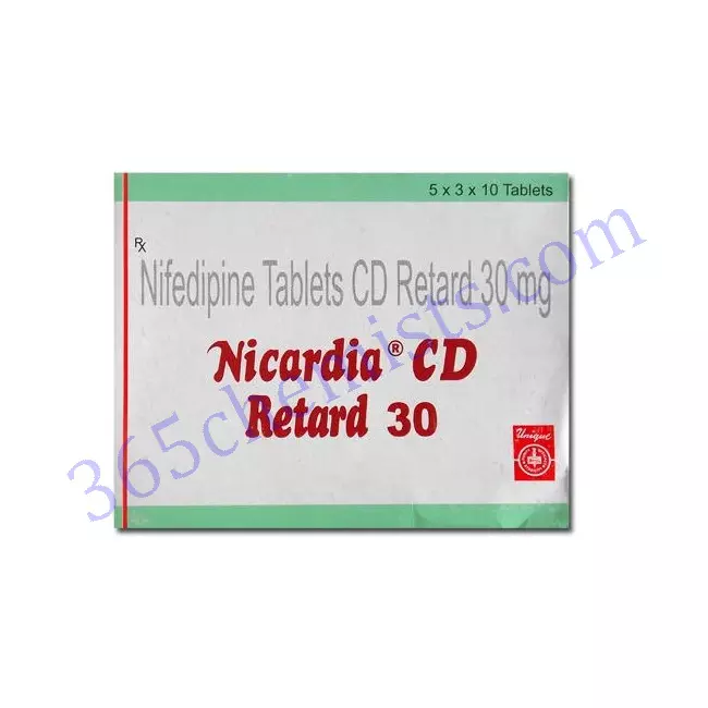 NICARDIA CD RETARD 30MG contains Nifedipine which belongs to a group of medicines called calcium antagonists. It is used to treat high blood pressure and to control angina (chest pain). It lowers blood pressure by relaxing the blood vessels so the heart does not have to pump as hard. It controls chest pain by increasing the supply of blood and oxygen to the heart.