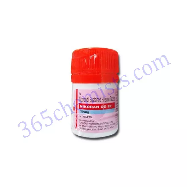 Nicorandil is the active ingredient in the Nikoran OD 20 mg Tablet, which is a medication that is used for the treatment of angina pectoris. It does this by relaxing and expanding the blood vessels, which results in an increase in blood flow to the heart as well as a reduction in both the frequency and severity of angina attacks. It is essential to take this medication exactly as directed, in accordance with the recommended dosage, and to observe all of the safety measures that have been outlined. To address any concerns or adverse effects that may arise while undergoing treatment, it is essential to conduct routine monitoring and maintain close communication with your physician. When used appropriately and under the supervision of a medical professional, the Nikoran OD 20 mg Tablet can play a significant part in the management of angina pectoris. This medication can provide relief from symptoms and improve overall quality of life.