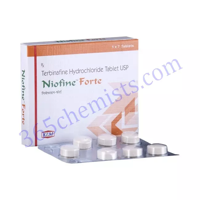 - Niofine Front Tablet is formulated with a high potency of terbinafine, with each tablet containing 500mg of the active ingredient. This gives the tablet a high level of effectiveness. Because of the medication’s high concentration, it has a potent antifungal effect and is more effective at treating fungal infections.