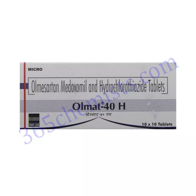 Hydrochlorothiazide and olmesartan medoxomil are both components of the medication combination known as Olmat H 40 Tablet. This medication is prescribed for the treatment of hypertension and other cardiovascular conditions that are related. It accomplishes effective control of blood pressure as well as a reduction in the risk of complications through the combination of a diuretic and an angiotensin II receptor blocker. The tablet has a low risk of side effects, and those that do occur are typically mild and short-lived. It is generally well tolerated. Nevertheless, it is essential to take the medication exactly as directed, including the dosage, and to speak with a qualified medical professional if any concerns or adverse effects occur. Tablets of Olmat H 40, when used correctly and monitored carefully, have the potential to become an indispensable component in the management of hypertension, thereby contributing to improved cardiovascular health and general well-being. To complement the effects of Olmat 40mg H Tablet and achieve optimal blood pressure control, it is essential to maintain regular checkups and to lead a healthy lifestyle, which entails eating a diet that is both nutritionally balanced and engaging in regular physical activity.