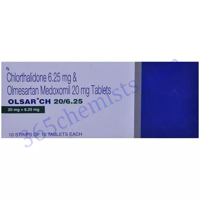 A drug called Olsar CH 20mg Tablet was created especially for the treatment of hypertension, or high blood pressure. The active components Olmesartan Medoxomil and Chlorthalidone are combined in this tablet at dosages of 20 mg and 6.5 mg, respectively. By combining the advantages of an angiotensin II receptor blocker (ARB) and a diuretic, it provides an efficient method for lowering blood pressure. Olsar CH 20 mg Tablet is a dependable and trusted alternative for anyone looking for efficient blood pressure control.