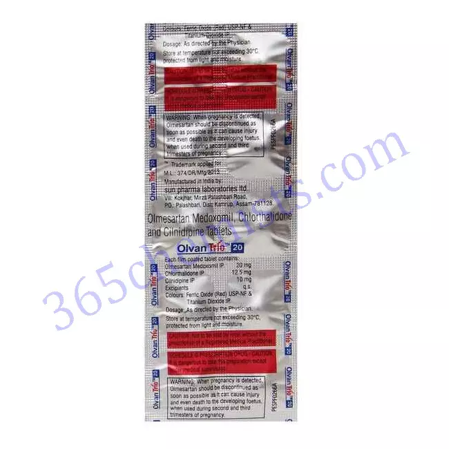 Olvan Trio 20 mg Tablet works by blocking the entry of calcium into the smooth muscle cells of the blood vessels. This action helps to relax and widen the blood vessels, resulting in a decrease in peripheral vascular resistance and lower blood pressure. By reducing the workload on the heart and improving blood flow, it helps to prevent complications associated with hypertension, such as heart attacks and strokes.