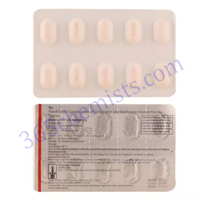 The management of diabetes mellitus type 2 can be accomplished with the use of a combination drug known as Ondero Met 2.5mg/500mg Tablet. Metformin and linagliptin are its two active ingredients, and they collaborate to bring about improvements in glycemic control and overall diabetes management through their presence in the product. Individuals who are looking for an effective treatment option to control their blood sugar levels and lower the risk of diabetes-related complications may want to consider the Ondero Met 2.5mg/500mg Tablet as a potential choice.