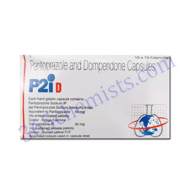 A combination drug called P2i-D Capsule contains Pantoprazole and Domperidone. Pantoprazole is a proton pump inhibitor (PPI), which lowers the production of stomach acid, whilst Domperidone is a prokinetic drug that helps to accelerate the motility of the stomach and intestines. Gastritis, gastroesophageal reflux disease (GERD), and other acid-related illnesses are all treated with this combination.