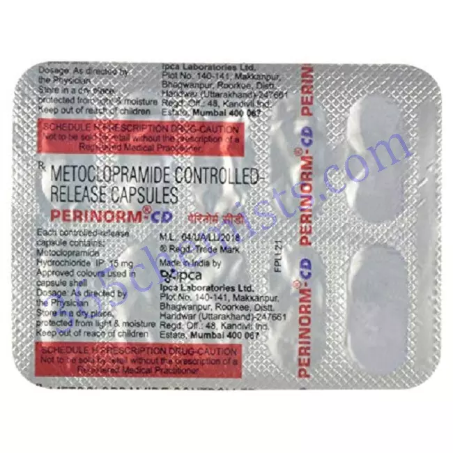 The drug Perinorm CD 15 mg Capsule, which contains metoclopramide, is used to treat gastrointestinal issues like nausea, vomiting, and problems with gastric motility. It aids in symptom relief and enhances digestive function by increasing stomach and intestine movement. It’s crucial to adhere to your healthcare provider’s instructions, the recommended dosage, and side effects in mind. Ask your healthcare provider for specific advice if you have any worries or questions about the medication.