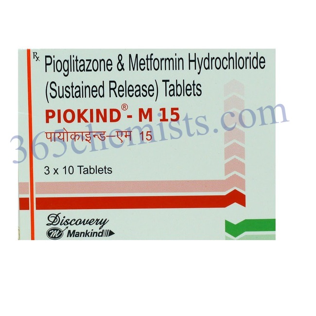 Piokind M 15 Tablet is used to control blood sugar levels in adults with type 2 diabetes mellitus.