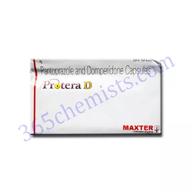 Protera D Capsule attaches to the dopaminergic receptors without causing any release of the chemical dopamine. It, in turn, facilitates gastric emptying and decreases small bowel transit time. Also, it binds to H+/K+-exchanging ATPase in gastric parietal cells, resulting in blockage of acid secretion.