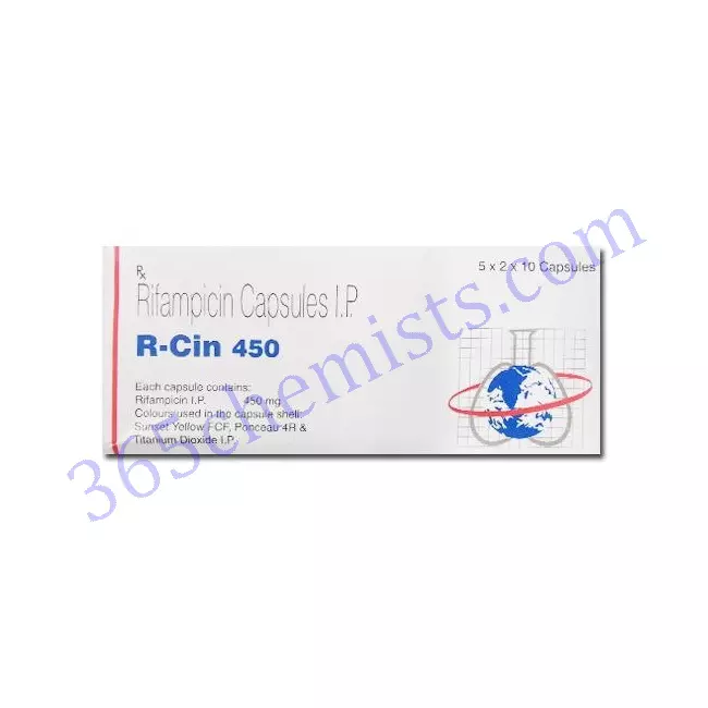 R-Cin 450Mg Capsule belongs to the rifamycin group of antibiotics and is used to treat numerous bacterial infections.This includes leprosy, tuberculosis and Legionnaire’s disease. This medicine is administered either by mouth or intravenously. It works by interfering and preventing the production of RNA by bacteria.