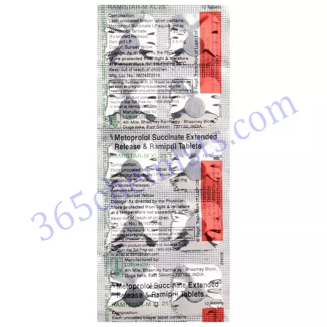 Ramistar-M XL 25mg Tablet is a combination medication containing Metoprolol Succinate and Ramipril. It is prescribed for the management of hypertension and helps lower blood pressure by combining the effects of a beta-blocker and an ACE inhibitor. It is important to take RamistarM XL 25mg Tablet as prescribed and follow your doctor’s instructions for optimal results. If you have any concerns or questions about the medication, consult your healthcare provider. Remember, this information is not a substitute for professional medical advice, and you should rely on the expertise of your healthcare professional for appropriate diagnosis and treatment.