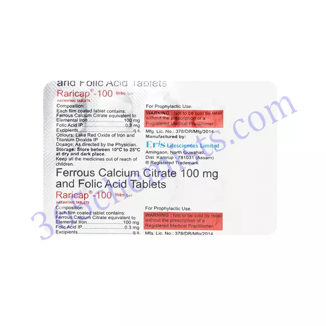 - Raricap 100 Tablet offers a comprehensive solution by providing both elemental iron and folic acid in a single formulation. This allows for the supplement to provide comprehensive nutritional support. This guarantees that the requirements for both iron and folic acid will be met simultaneously by the body.