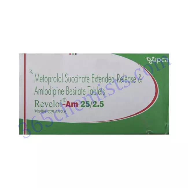 In order to successfully control blood pressure, the medications amlodipine and metoprolol succinate are combined in the tablet form of Revelol AM 25mg.