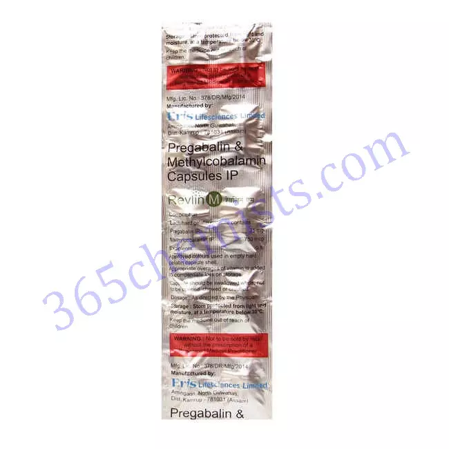 A medication called Revlin M Capsule combines the active ingredients methylcobalamin and pregabalin in doses of 750 mcg and 75 mg, respectively, per capsule. Methylcobalamin is a type of vitamin B12, and pregabalin is a medication that is used to treat both epileptic seizures and neuropathic pain. This article presents a general summary of Revlin M Capsule, covering topics such as its applications, recommended dosage, possible adverse effects, and safety considerations.