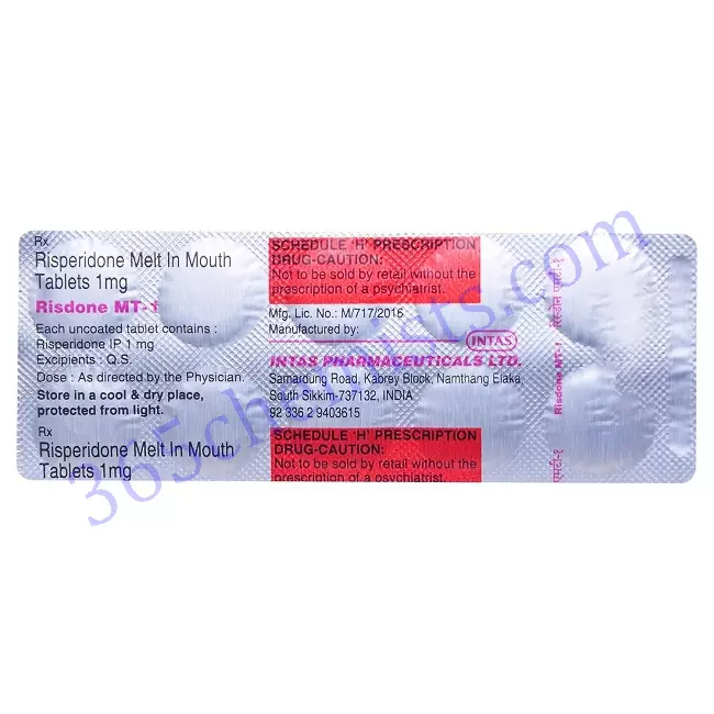 It is possible for the recommended dosage of Risdone MT 1mg Tablet to change depending on how an individual responds to treatment and how their condition is affected by the medication. It is essential to follow the instructions that have been provided by a healthcare professional or that are mentioned on the label of the prescription. In most cases, the tablet should be swallowed whole, either with or without food. It should be chewed, crushed, or ground up in any way before being swallowed whole with a full glass of water. It is essential to take the medication in the exact quantity that was prescribed, and it is best not to make any adjustments to the dosage without first speaking with a medical professional.