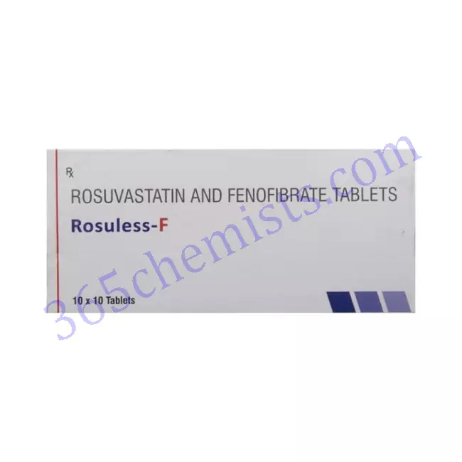 A combination medication known as Rosuless F 10mg Tablet (Fenofibrate 160mg/Rosuvastatin) is prescribed to patients in order to treat lipid disorders and improve cardiovascular health. It offers a comprehensive method of lipid management because it takes advantage of both fenofibrate and rosuvastatin, both of which have a number of positive effects. It is essential to take the medication exactly as directed by your doctor, including the dosage, and to speak with a medical professional if you experience any disturbing side effects. Rosuless F 10mg Tablet has the potential to support your cardiovascular health and contribute to the overall management of lipid disorders if it is utilised correctly and monitored on a consistent basis.