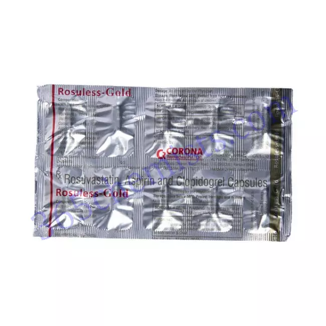 Aspirin and rosuvastatin are the two active components that are included in each Rosuless Gold 20mg Capsule. This medication is a combination product. The purpose of this detailed guide is to provide important information about Rosuless Gold 20mg Capsule, such as its applications, recommended dosage, potential adverse effects, safety considerations, and more. This medication is designed to help manage cardiovascular conditions, particularly in people who are already at a high risk for developing them. It does this by combining the beneficial effects of aspirin and rosuvastatin. The benefits of Rosuless Gold 20mg Capsule can be maximised by having a thorough understanding of how each component works and by adhering to the guidelines that are provided.